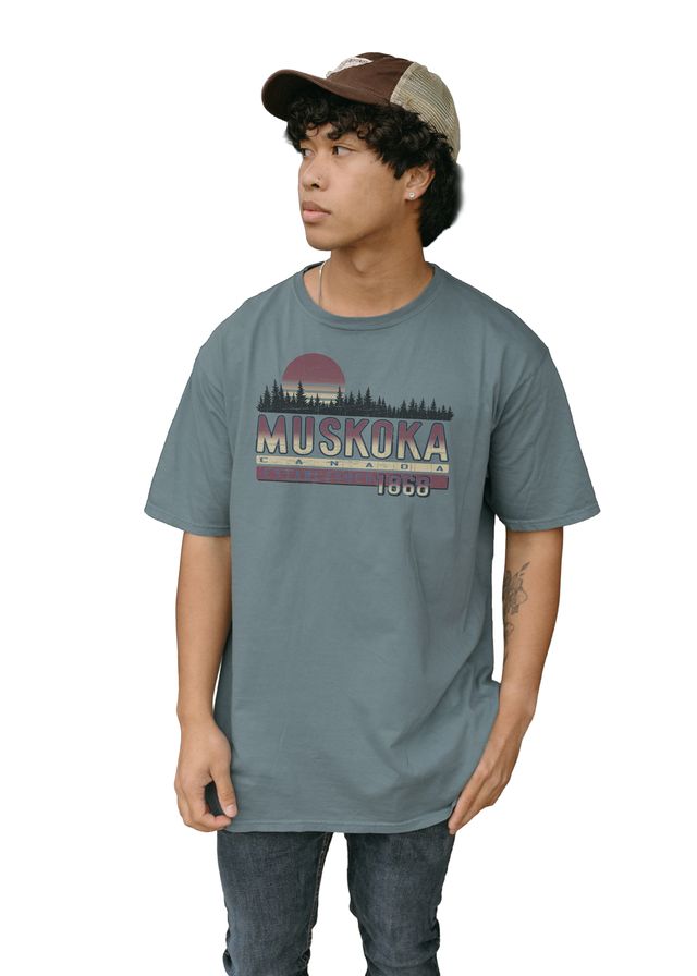 Show your Muskoka pride in this Retro Sunset Tee, featuring a vintage forest graphic and soft cotton comfort. Designed for laid-back weekends, road trips, and lakeside living.