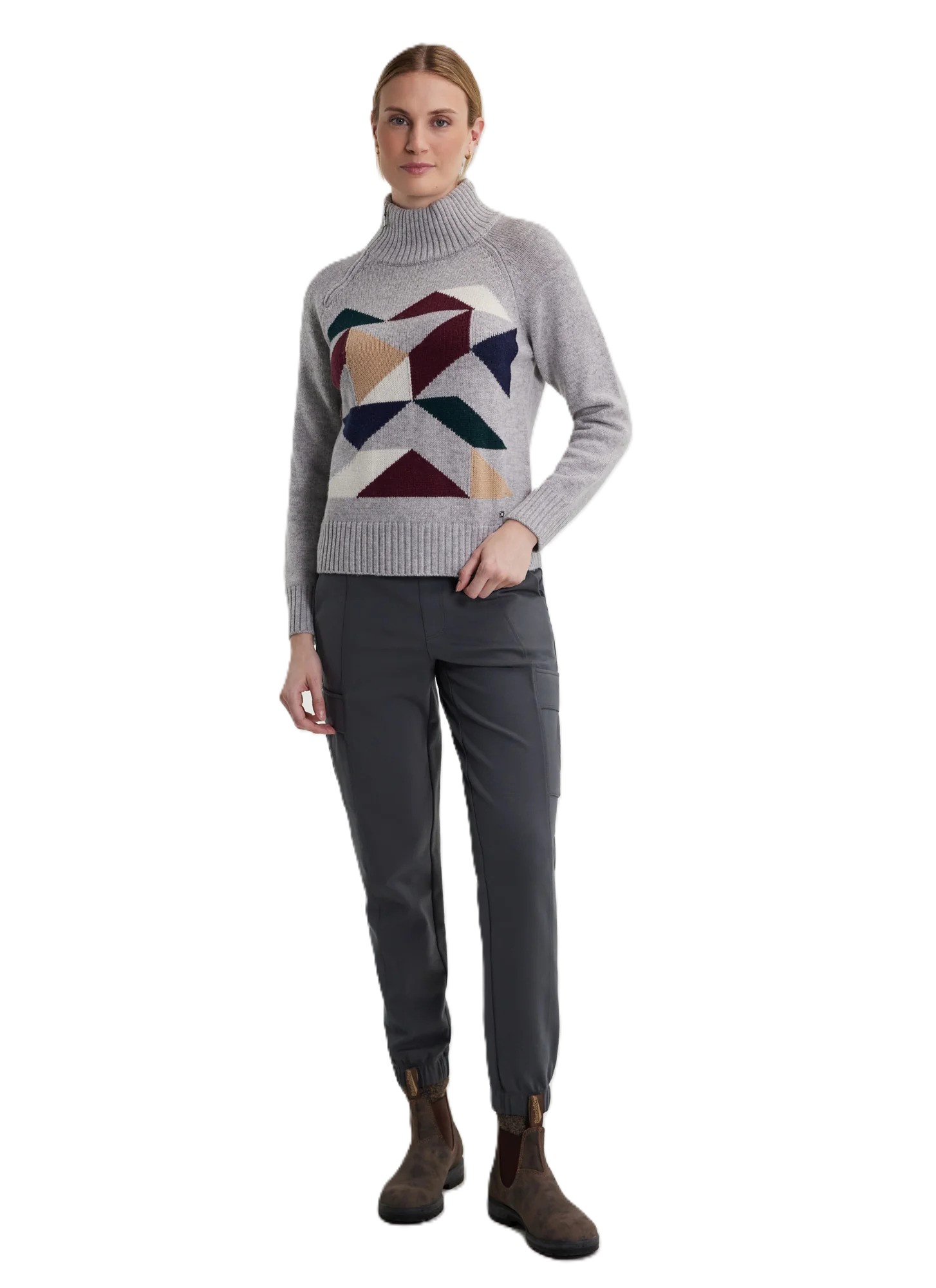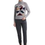 Express your style with this unique sweater. Made of 100% Merino wool, it stands out with its high asymmetric zip collar and colorful geometric print. Perfect for a trendy and comfortable everyday look, it combines originality and warmth.